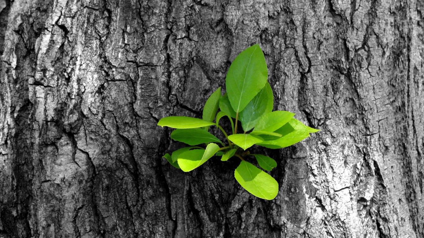 Wallpaper Green sprout on the gray bark of a tree