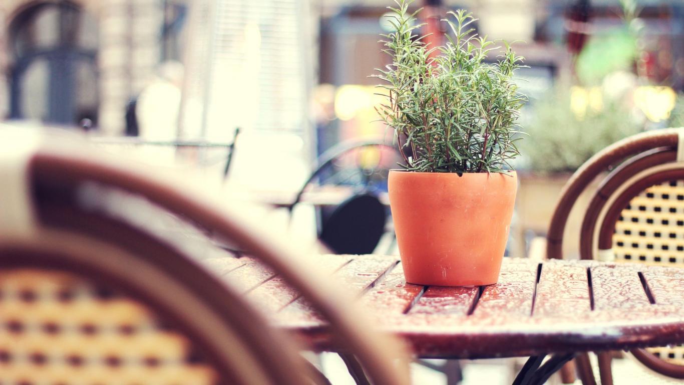 Wallpaper Flower in a pot on the table of street cafe