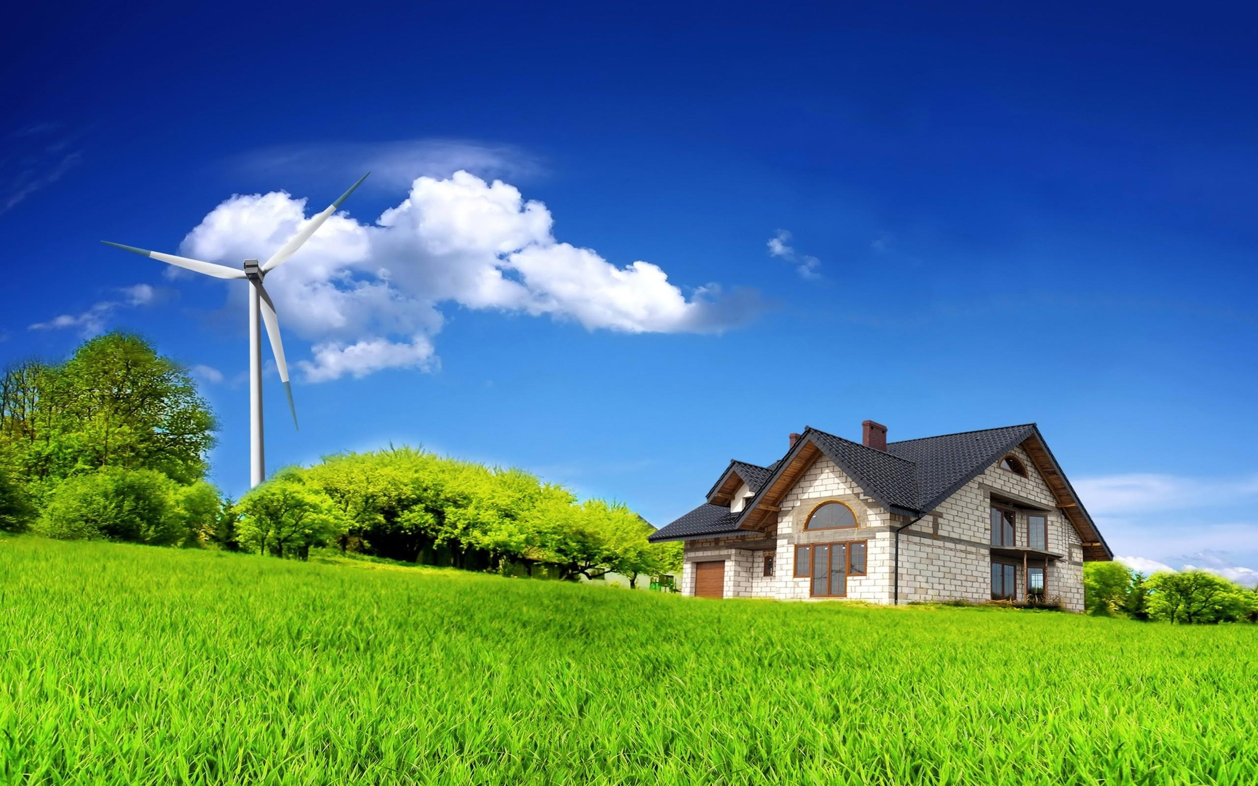 Wallpaper Wind turbine in a field near the house