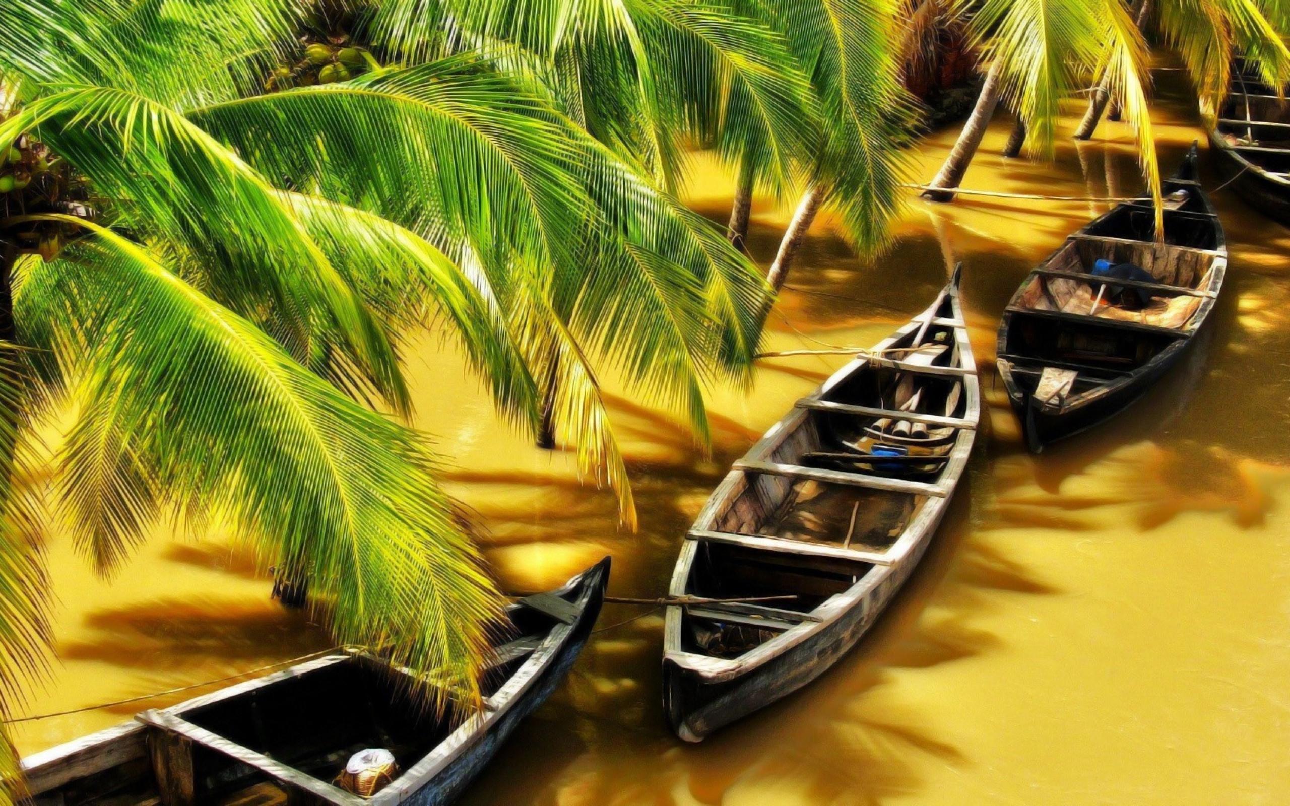 Wallpaper Boats under the palm trees on the brown river
