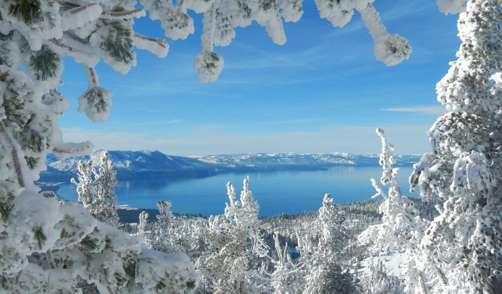 Wallpaper Mountain Lake in the frame of the snow-covered branches