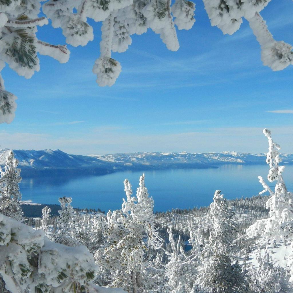 Wallpaper Mountain Lake in the frame of the snow-covered branches