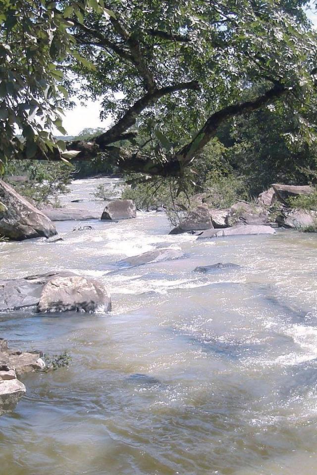 Wallpaper Rocky river with trees on the shore