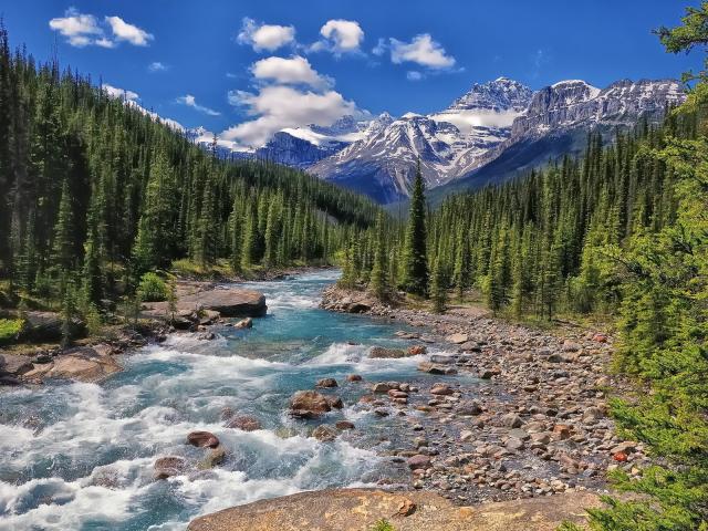 Wallpaper Rapid river flows through a coniferous forest