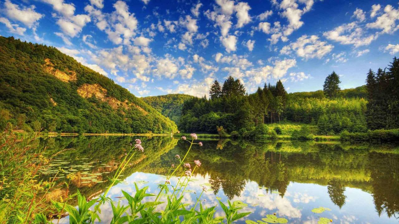 Wallpaper Lake of wooded hills