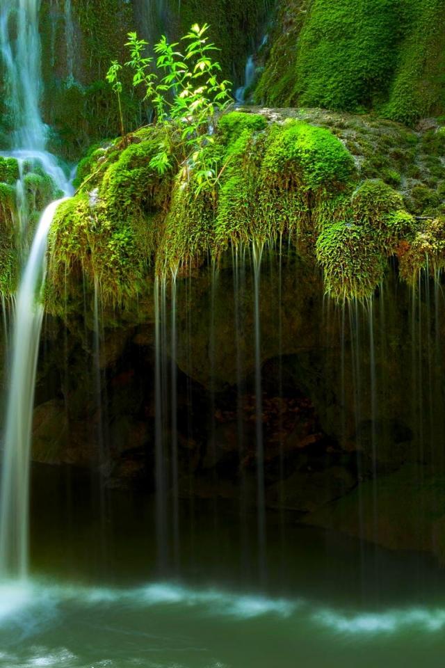 Wallpaper Water flows over moss-covered rocks