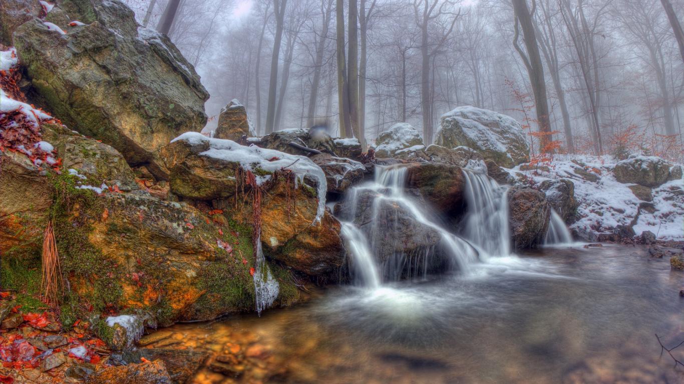 Wallpaper Waterfall on the background of misty forest