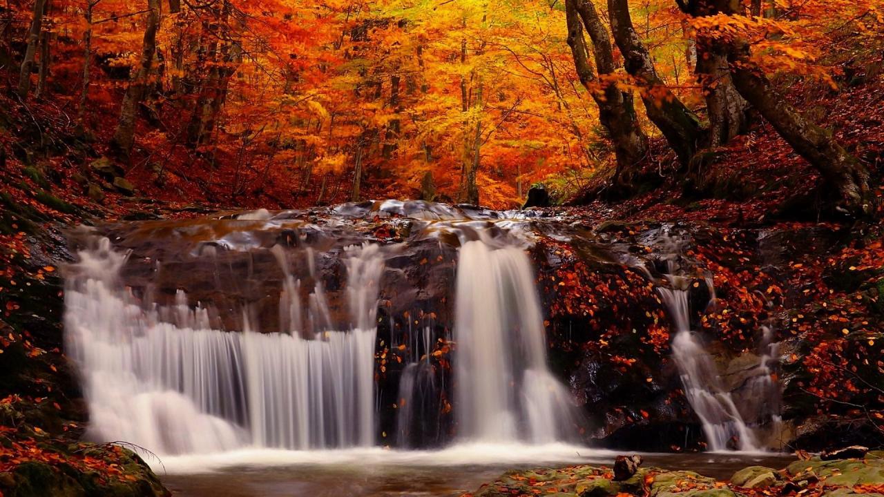 Wallpaper Waterfall on the rocks in the autumn forest