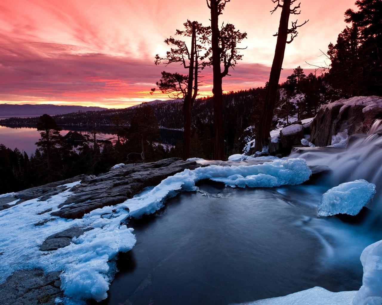 Wallpaper Waterfall in the ice at sunset