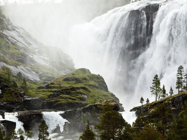 Wallpaper Moss-covered rocks on the background of a waterfall