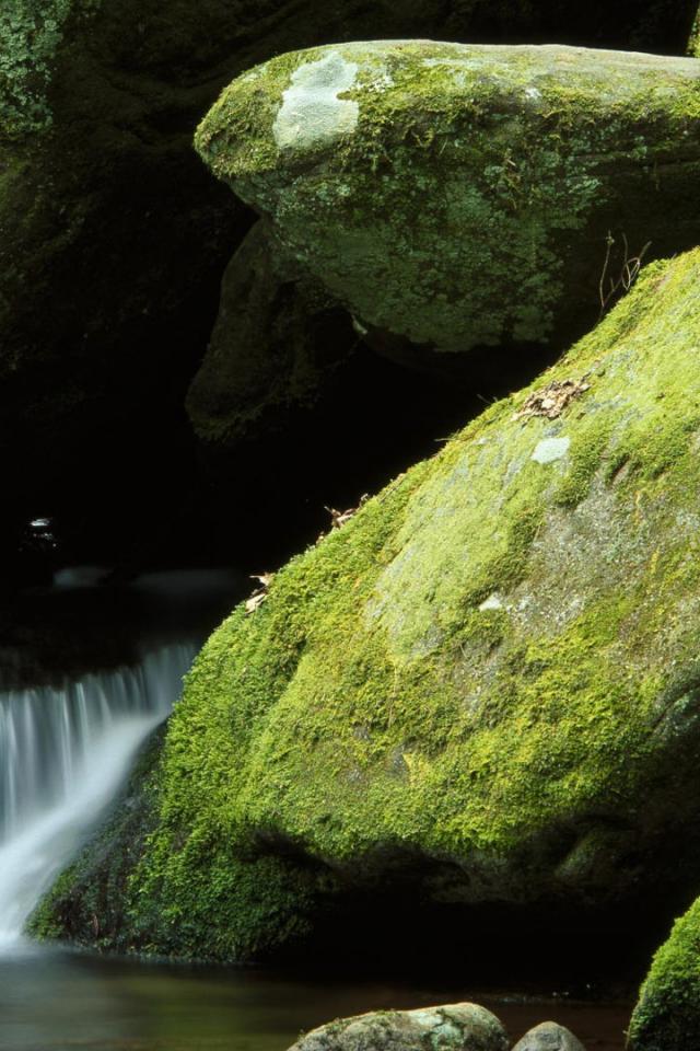 Wallpaper Falls among huge boulders