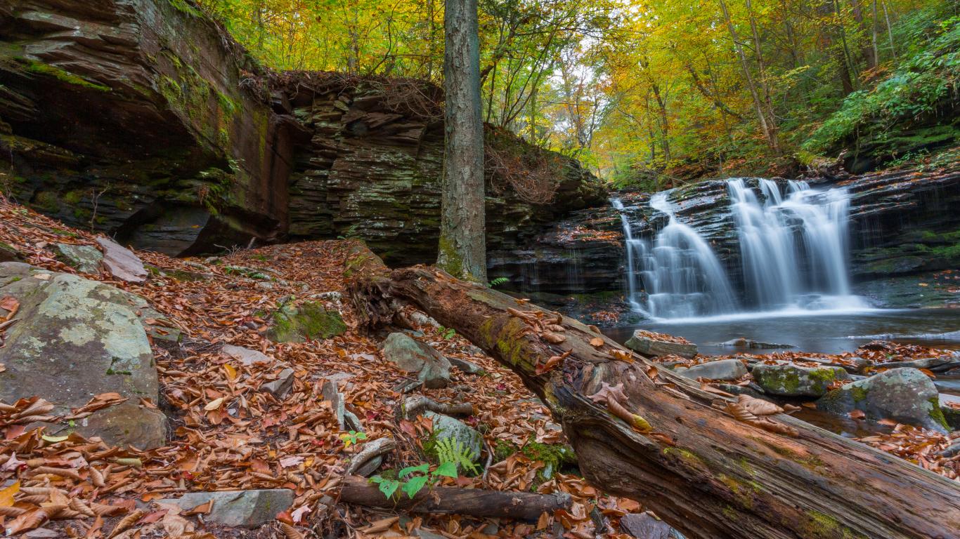 Wallpaper Moss-covered rocks on the background of a waterfall