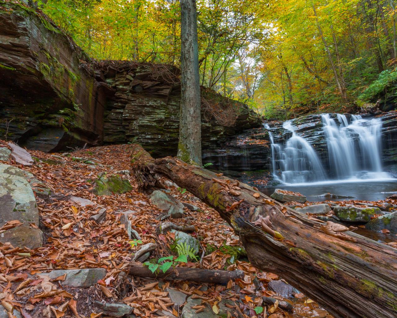 Wallpaper Waterfall on the rocks in the autumn forest