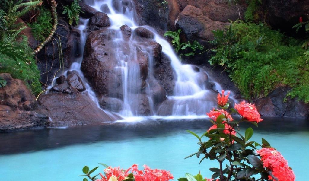 Wallpaper Red flowers on the background of the waterfall