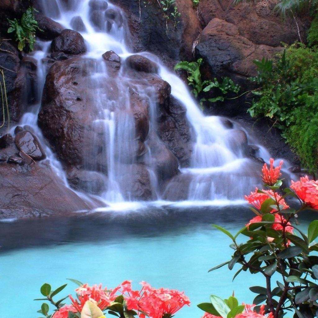 Wallpaper Red flowers on the background of the waterfall