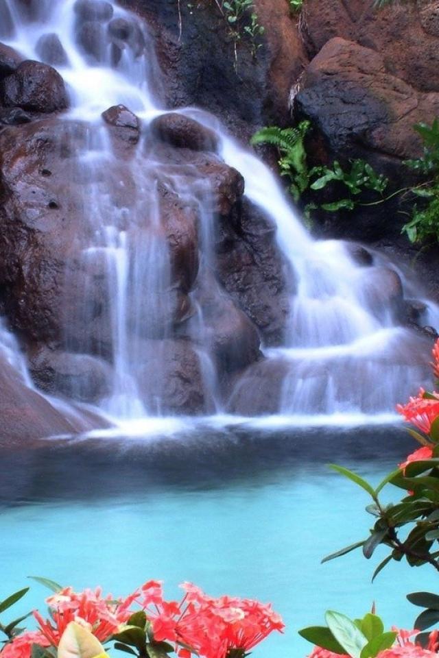 Wallpaper Red flowers on the background of the waterfall