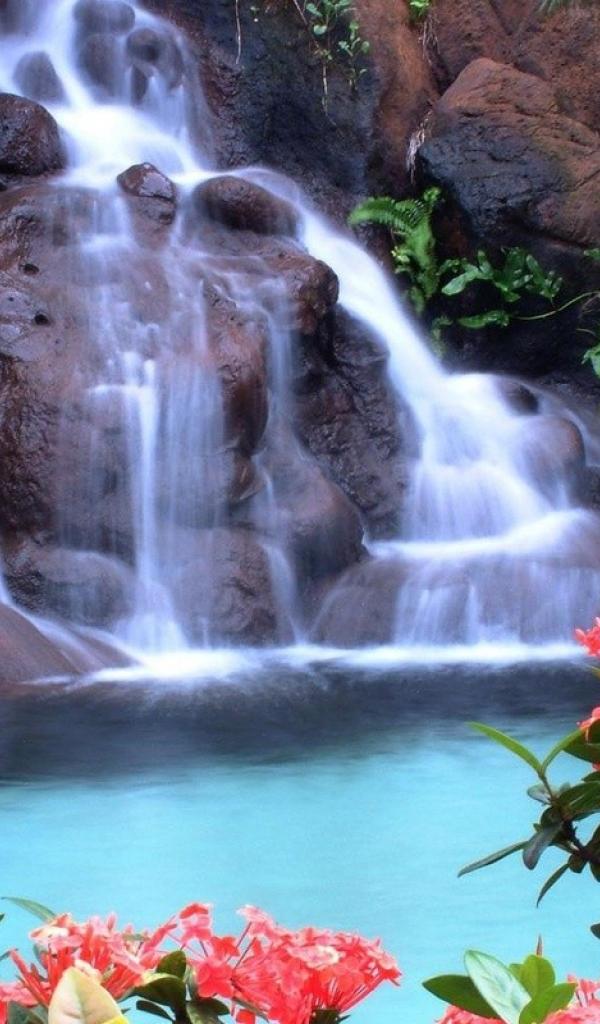 Wallpaper Red flowers on the background of the waterfall