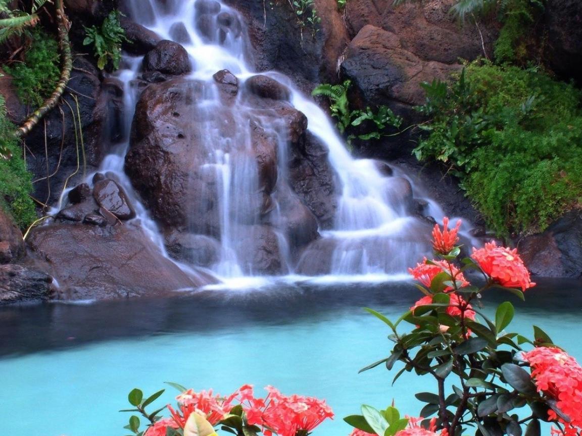 Wallpaper Red flowers on the background of the waterfall