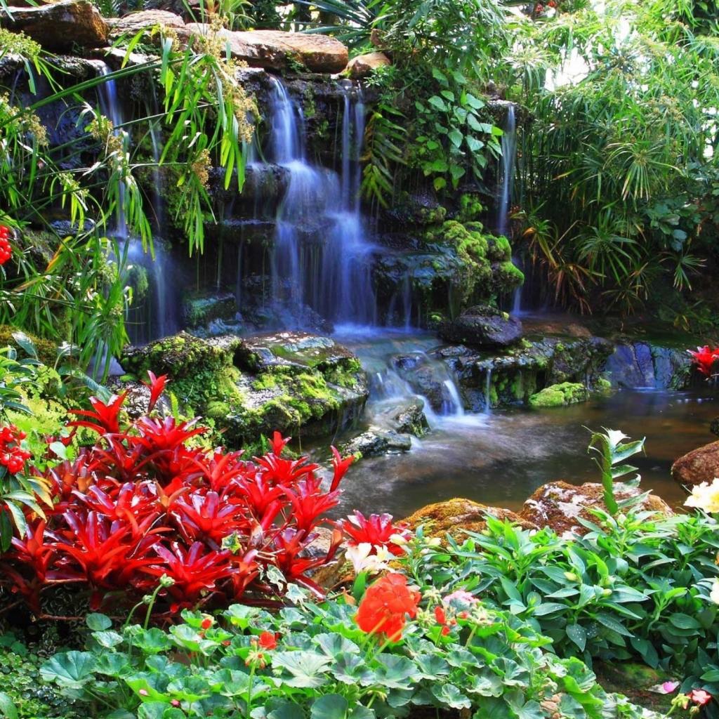 Wallpaper Red flowers at the waterfall