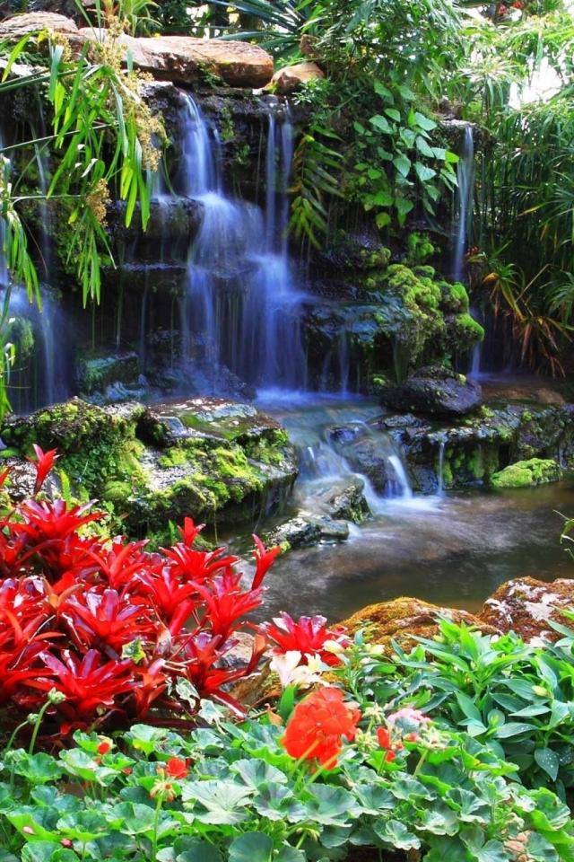 Wallpaper Red flowers at the waterfall