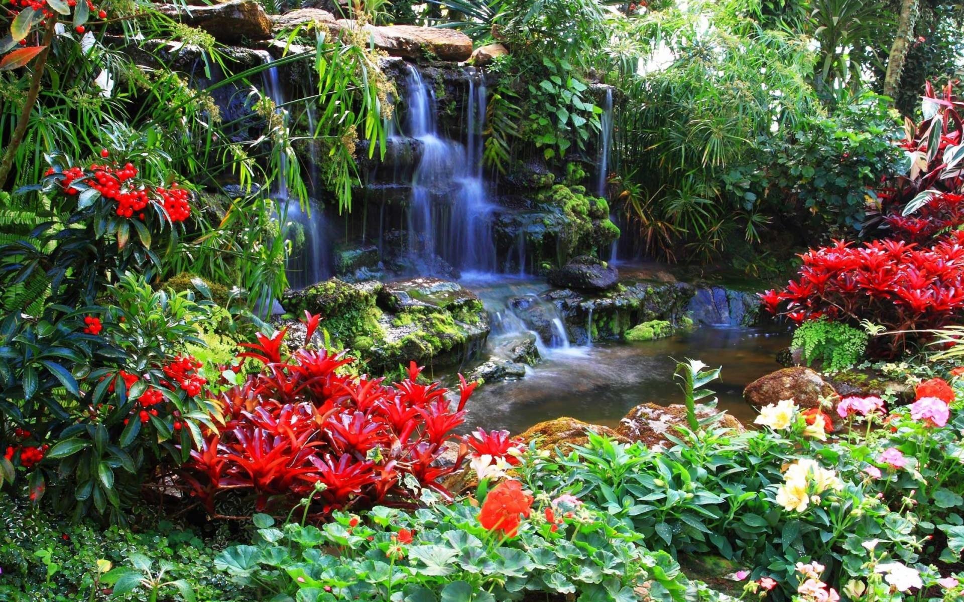 Wallpaper Red flowers at the waterfall