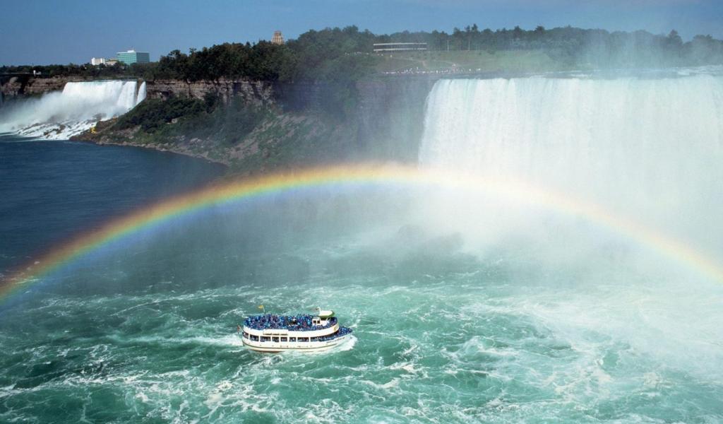 Wallpaper Boat under the rainbow waterfall