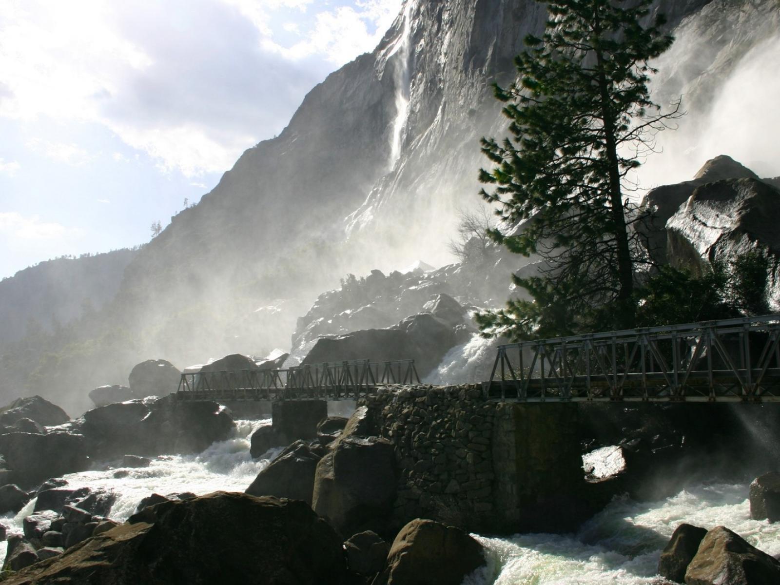 Wallpaper Lonely pine tree near the waterfall