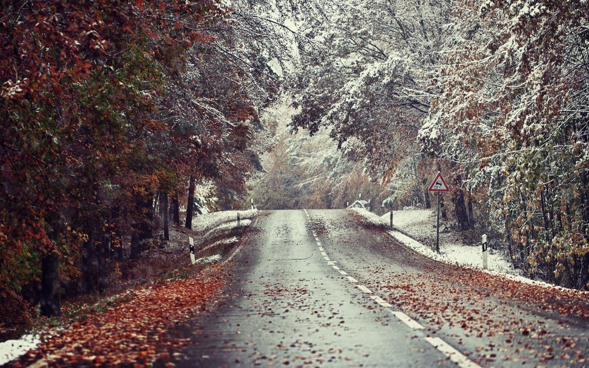 Wallpaper Meeting of winter and autumn by the roadside