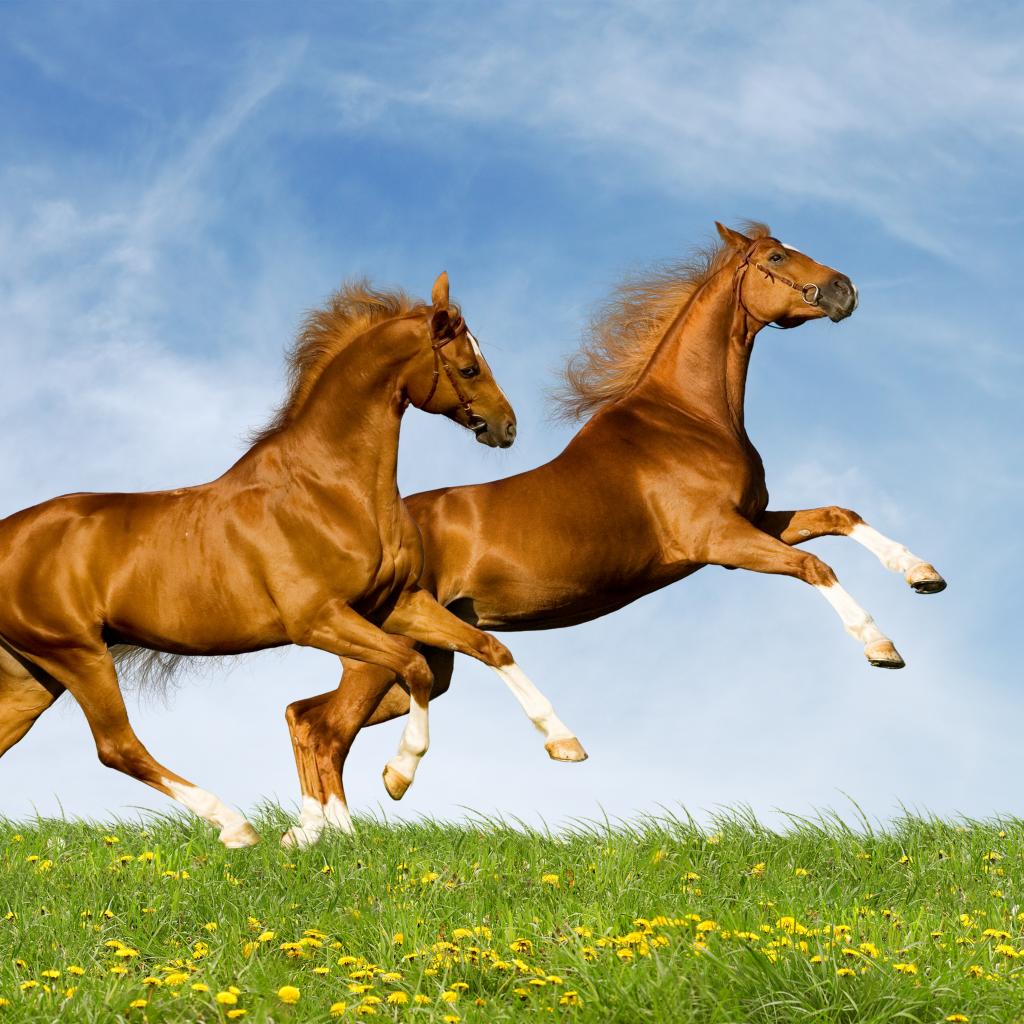 Wallpaper Young horses on a field of yellow flowers