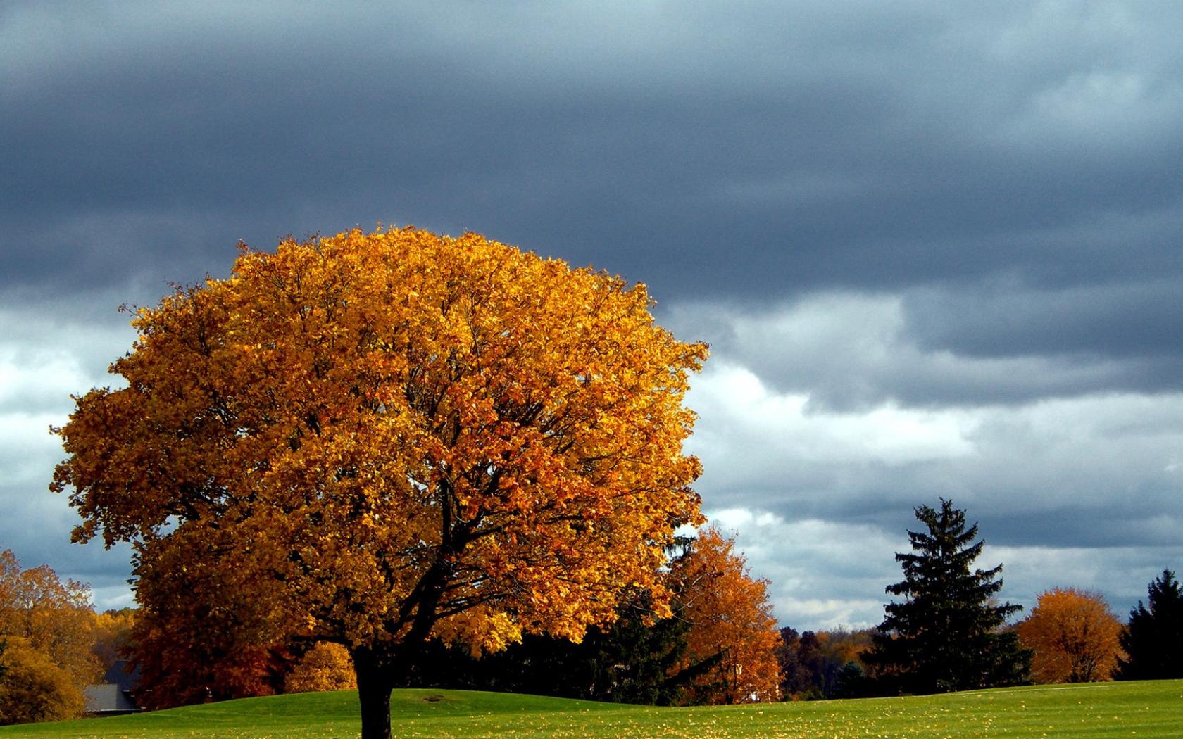Wallpaper Separate autumn tree on the lawn in the park