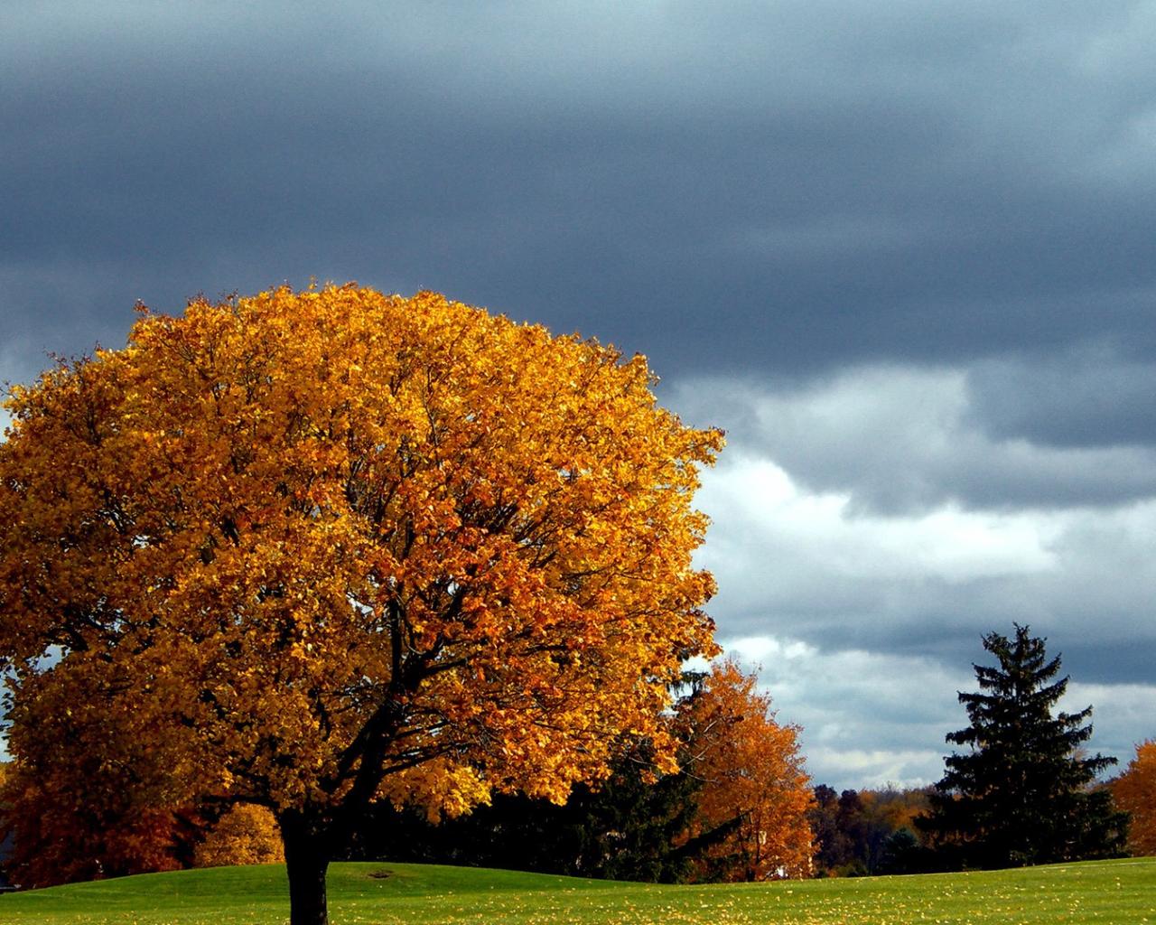 Wallpaper Separate autumn tree on the lawn in the park