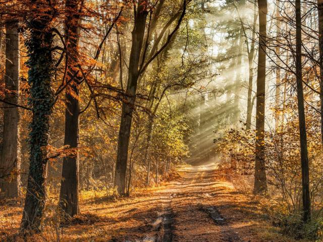 Wallpaper The sun`s rays through the trees in the autumn forest