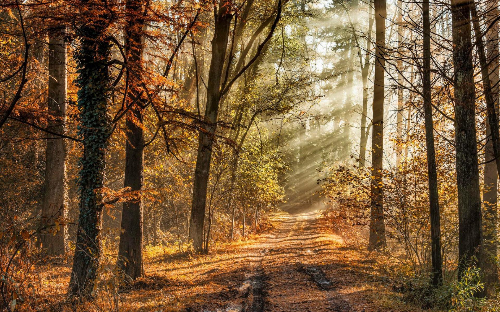 Wallpaper The sun`s rays through the trees in the autumn forest