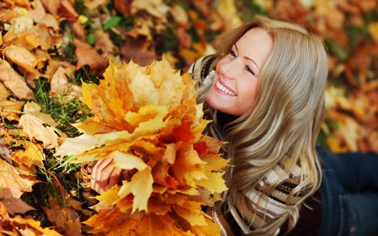 Wallpaper Beautiful girl is holding autumn leaves