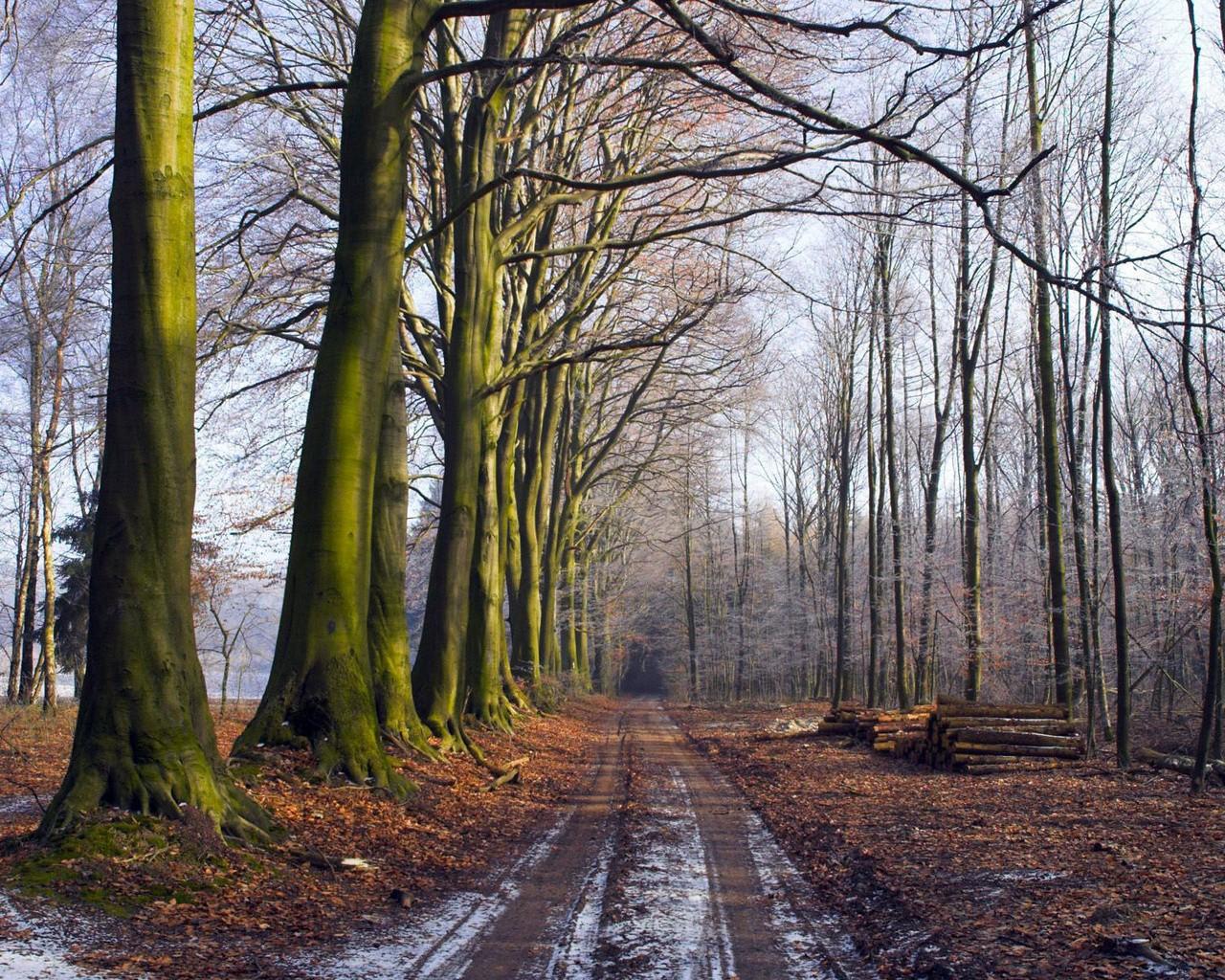 Wallpaper Autumn trees on the background of the first snow reflected in the water