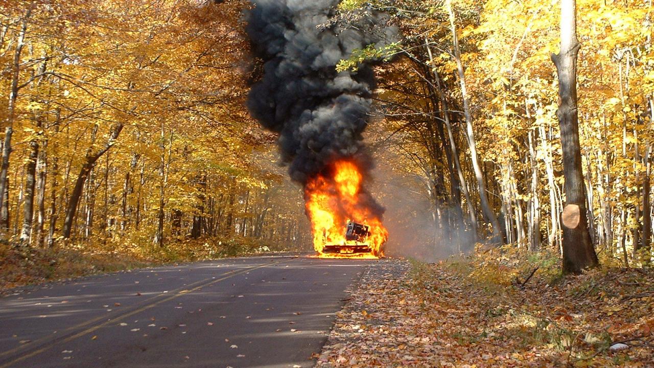 » Wallpaper Autumn on the road is burning car