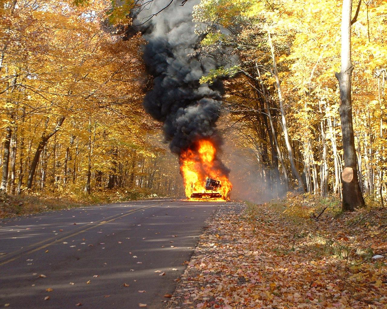 » Wallpaper Autumn on the road is burning car