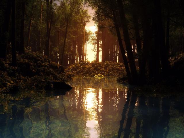 Wallpaper Spring River in the forest at sunset
