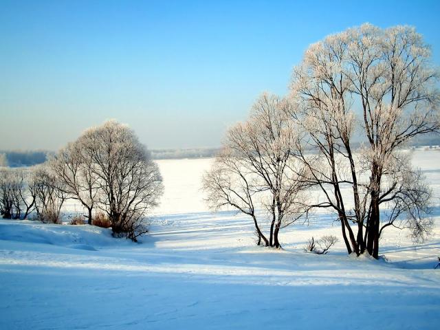 Wallpaper Trees in frost in the middle of untouched snow in a field