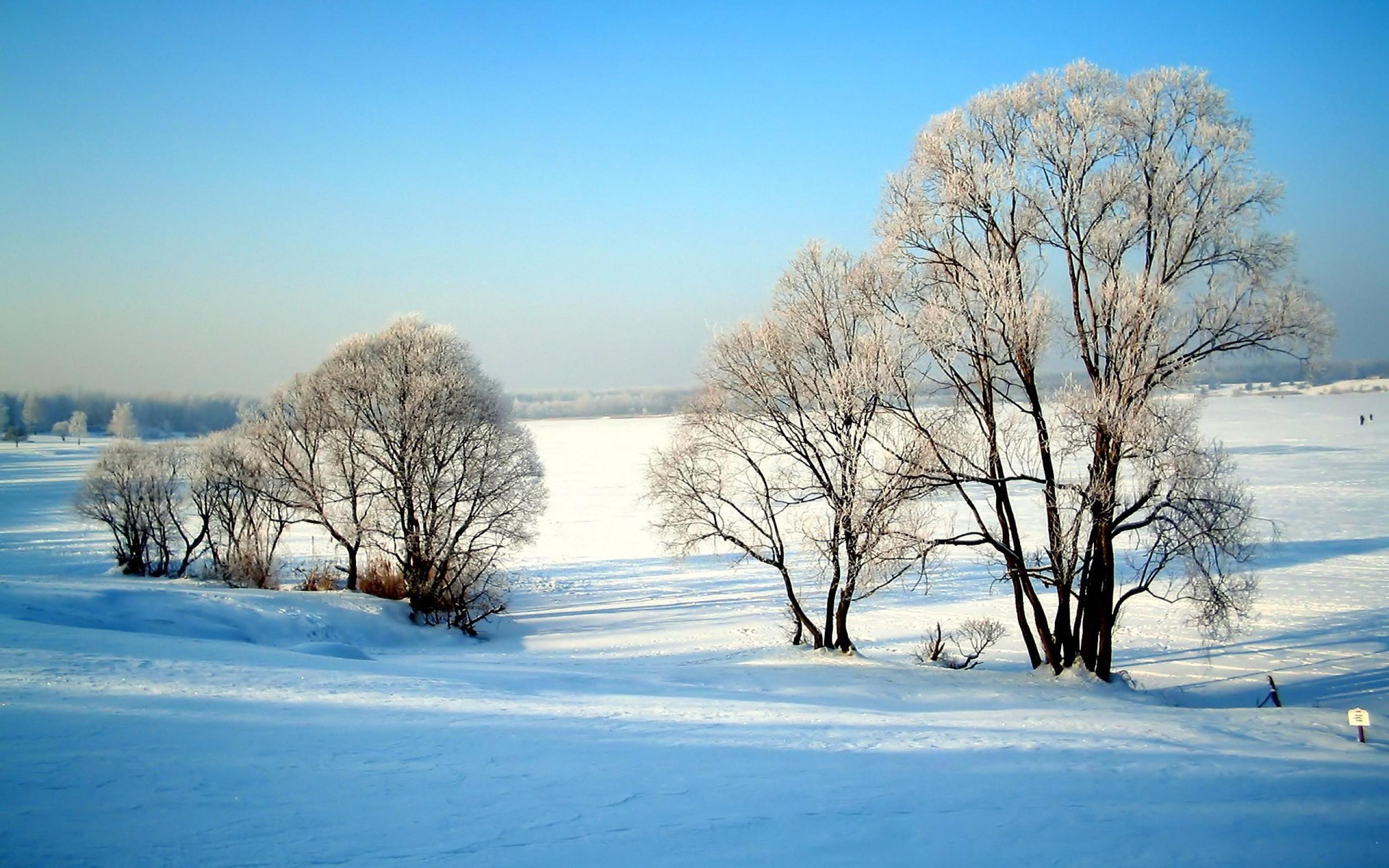 Wallpaper Trees in frost in the middle of untouched snow in a field