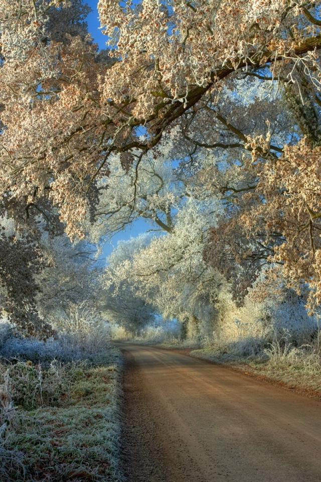 Wallpaper Frosted branches hanging over the road