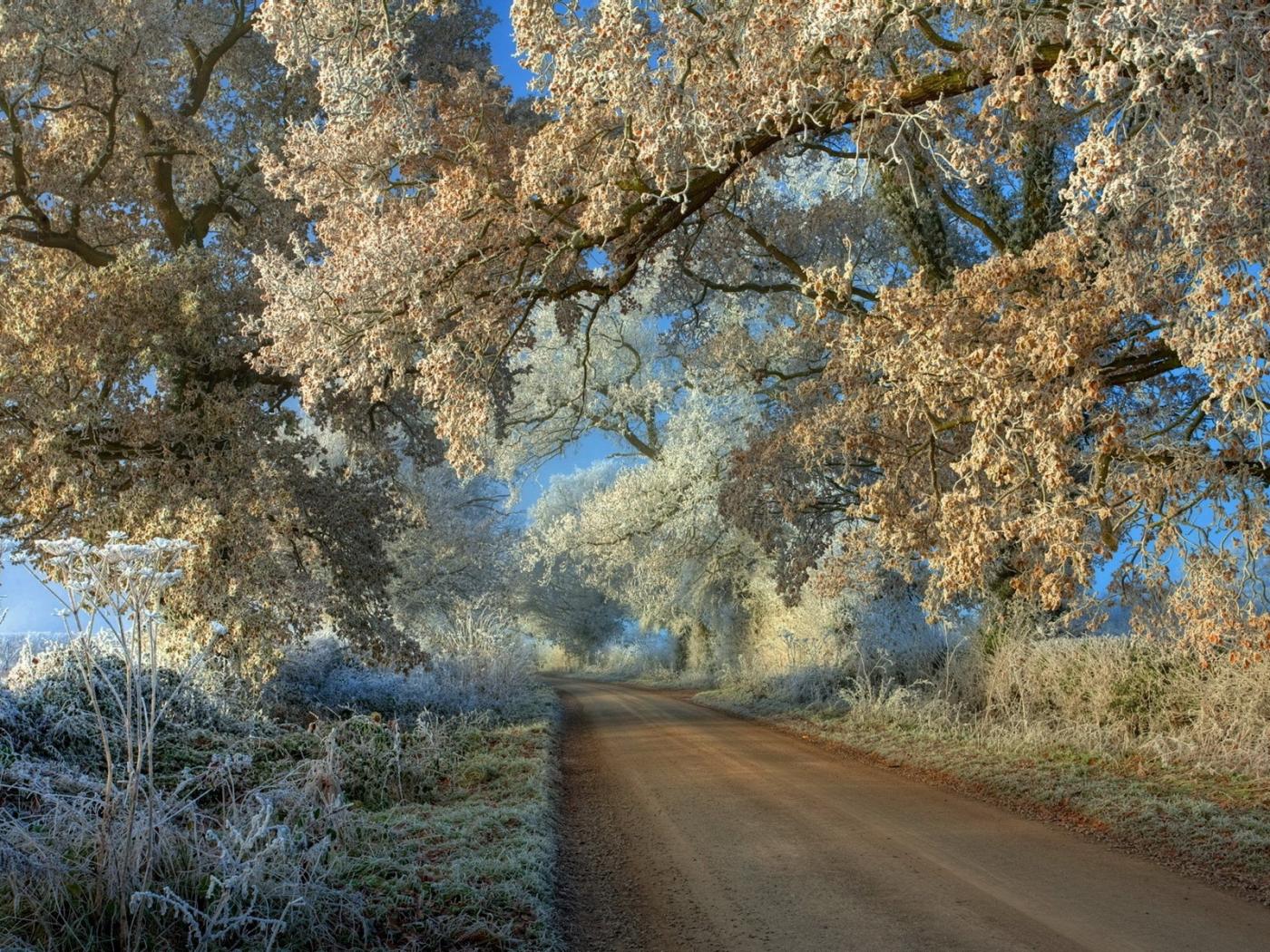 Wallpaper Frosted branches hanging over the road