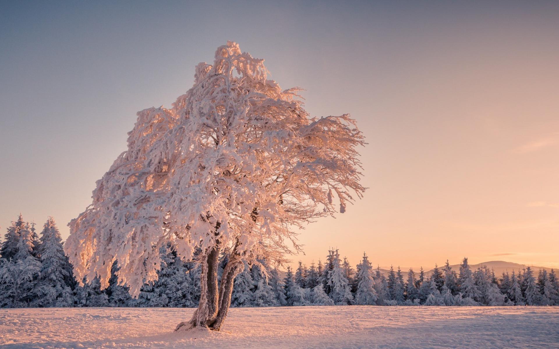 Wallpaper Lonely frosted tree in a field