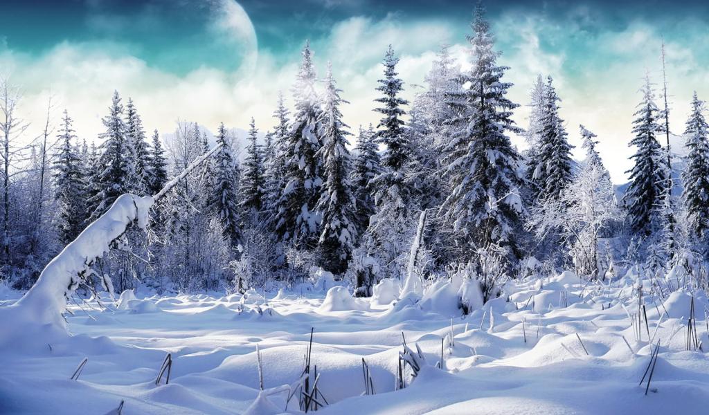 Wallpaper Planet over the snow-covered forest