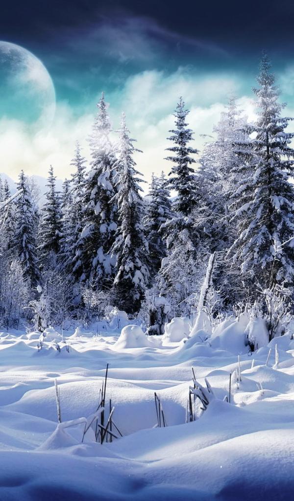 Wallpaper Planet over the snow-covered forest
