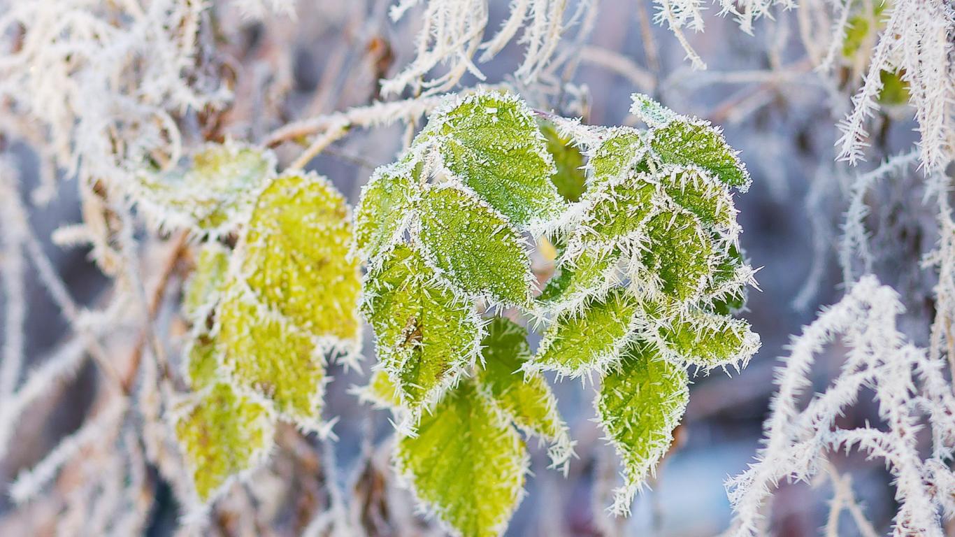 Wallpaper Frost on green leaves