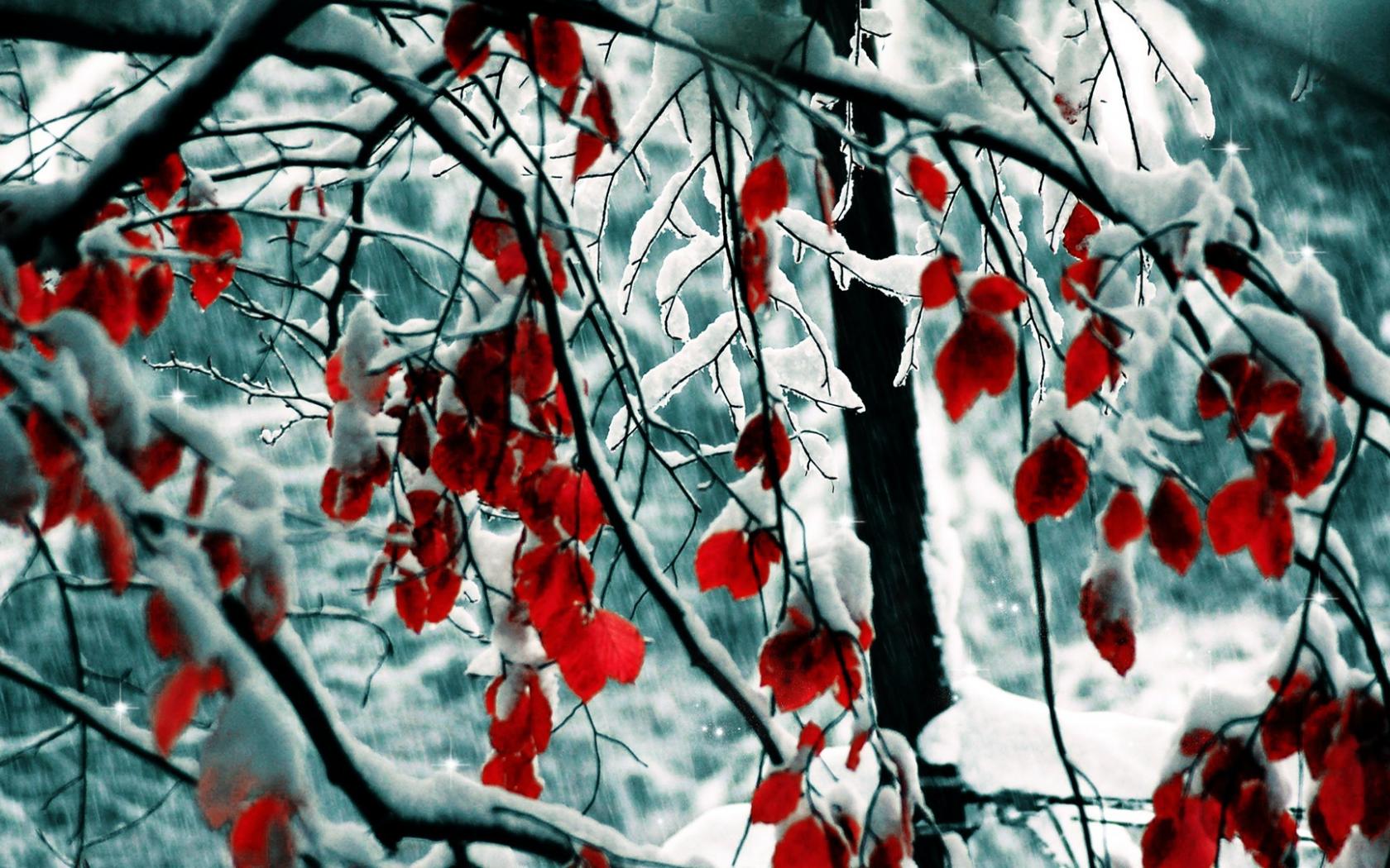 Wallpaper Snow on red leaves