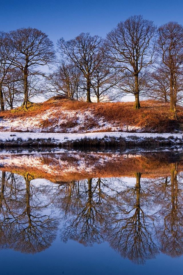 Wallpaper Shore of the lake is covered with snow