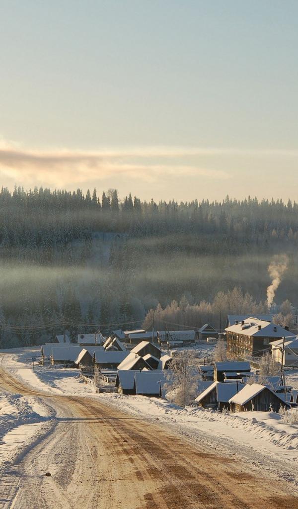 Wallpaper Winter road and the village