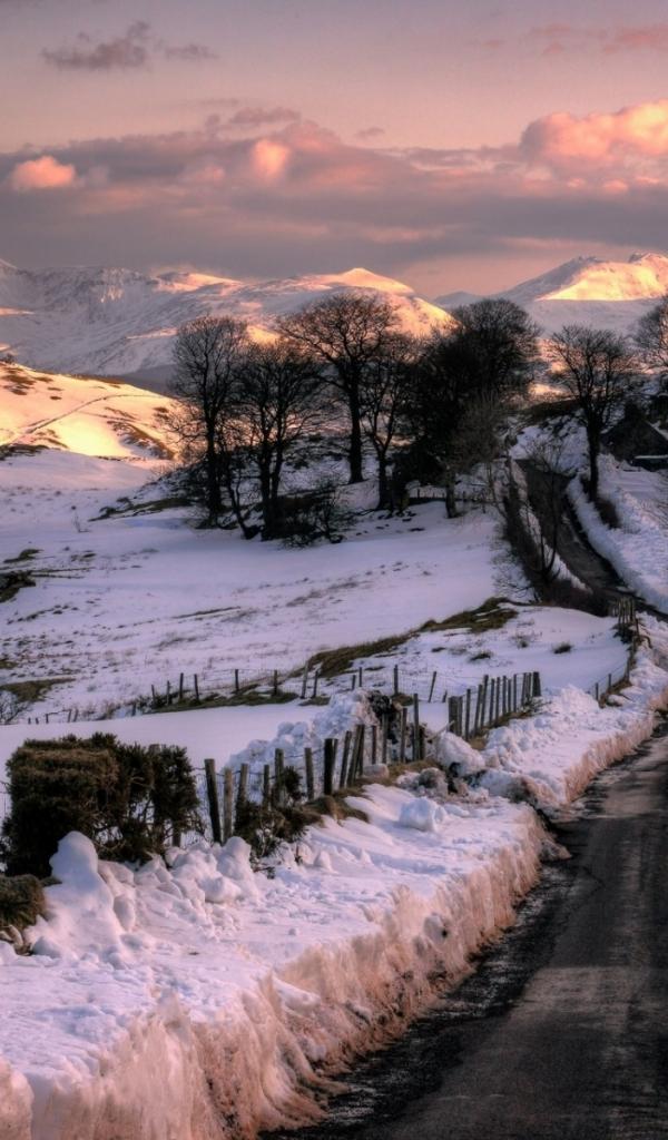 Wallpaper Road in winter on a background of beautiful mountains